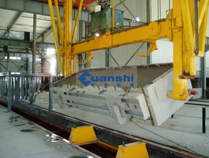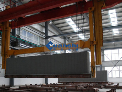 翻轉(zhuǎn)吊具是加氣混凝土生產(chǎn)設(shè)備中主要配套設(shè)備,翻轉(zhuǎn)吊具將坯體(帶模具和側(cè)板)在空中翻轉(zhuǎn)90度,吊放在切割臺(tái)或切割小車上,脫去�?�,坯體即能切割。