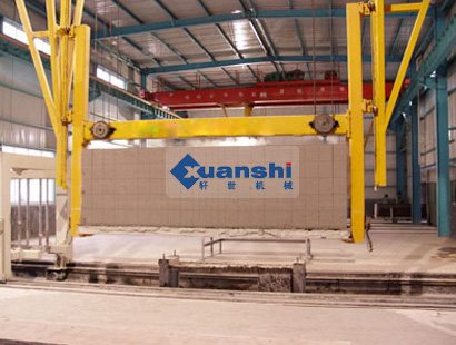 1、將澆注養(yǎng)護(hù)后的坯體帶模框和側(cè)板凌空吊起,翻轉(zhuǎn)90度(坯體已直立),吊放至切割臺(tái)進(jìn)行開模、脫模。吊去�?颍黧w即能切割。
