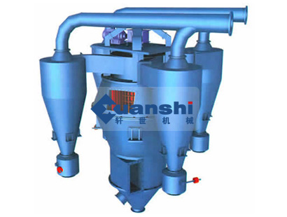 該機(jī)由調(diào)速傳動(dòng)部分、主軸轉(zhuǎn)子部分、分級(jí)圈、旋風(fēng)筒、滴流裝置、殼體、風(fēng)機(jī)等組成,物料由進(jìn)料口落到撒料盤上,在離心力作用下沿徑向甩出而分散于選粉室內(nèi)與旋轉(zhuǎn)上升氣流相遇,與分級(jí)圈一起高速旋轉(zhuǎn),使氣流中的物料受到較強(qiáng)離心力作用,通過分級(jí)圈的細(xì)粉經(jīng)旋風(fēng)筒收集落入集灰斗,由下部細(xì)粉口排出,粗粉落到滴流裝置,從粗粉口排出。