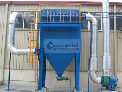 當(dāng)含塵氣體由進風(fēng)口進入除塵器沉降室,首先碰到進風(fēng)口隔板,氣流便轉(zhuǎn)向流入灰斗,同時氣流速度放慢,由于慣性作用,使氣體中粗顆粒粉塵直接流入灰斗。起預(yù) 收塵的作用,進入灰斗的氣流隨后折而向上通過內(nèi)部裝有金屬骨架的濾袋粉塵被捕集在濾袋的外表面,凈化后的氣體進入濾袋室上部清潔室,匯集到出風(fēng)口排出,含 塵氣體通過濾袋凈化的過程中,隨著時間的增加而積附在濾袋上的粉塵越來越多,增加濾袋阻力,致使處理風(fēng)量逐漸減少,為正常工作,要控制阻力在一定范圍內(nèi) (140--170毫米水柱),必須對濾袋進行清灰,清灰時由脈沖控制儀順序觸發(fā)各控制閥開啟脈沖閥,氣包內(nèi)的壓縮空氣由噴吹管各孔經(jīng)文氏管噴射到各相應(yīng) 的濾袋內(nèi),濾袋瞬間急劇膨脹,使積附在濾袋表面的粉塵脫落,濾袋得到再生。清下粉塵落入灰斗,經(jīng)排灰系統(tǒng)排出機體。由此使積附在濾袋上的粉塵周期地脈沖噴 吹清灰,使凈化氣體正常通過,保證除塵系統(tǒng)正常運行。